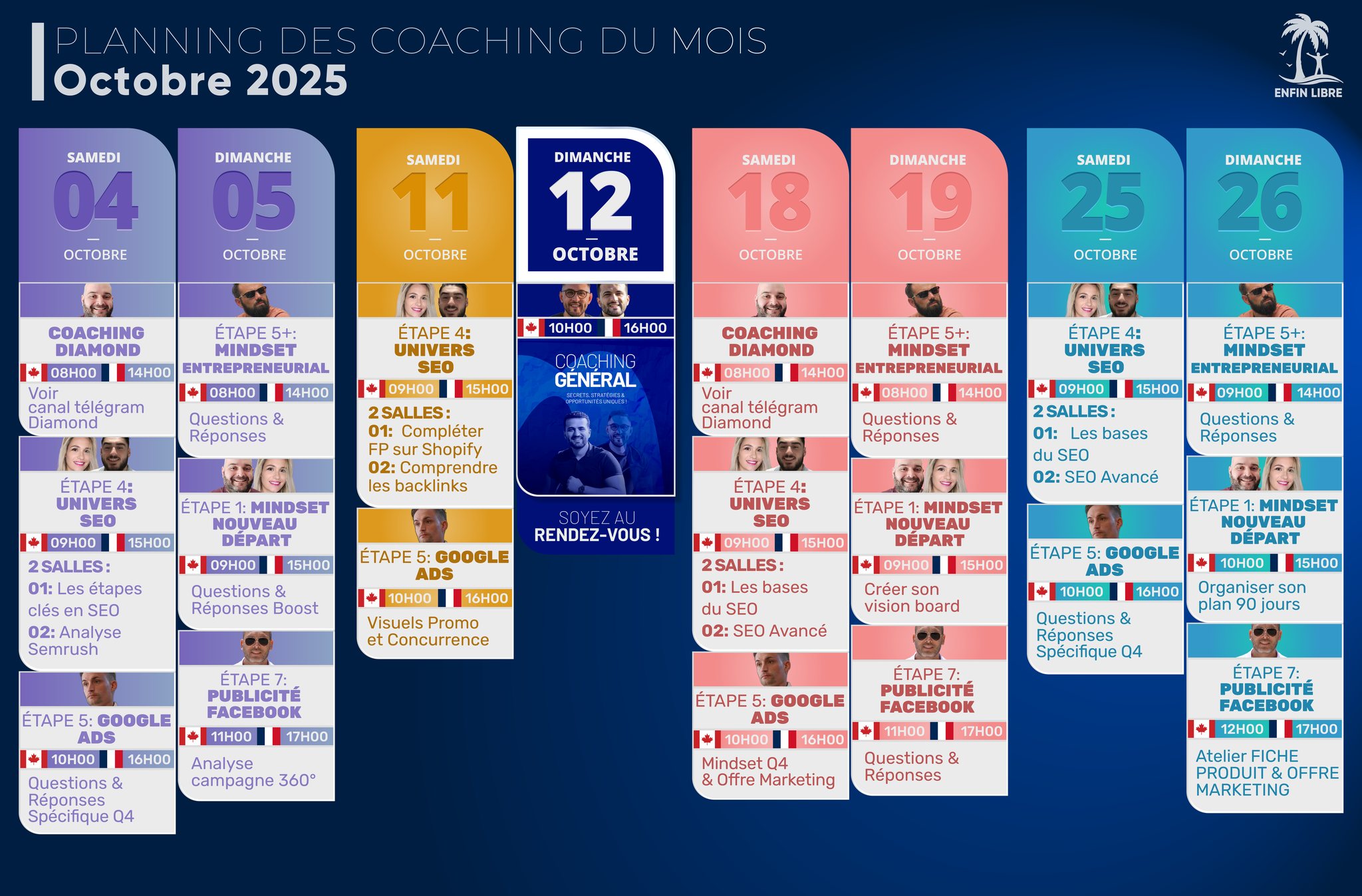 📅 Le planning mensuel des coachings est disponible ici ainsi que dans le post épinglé du groupe Facebook privé Enfin Libre: Ecommerce.